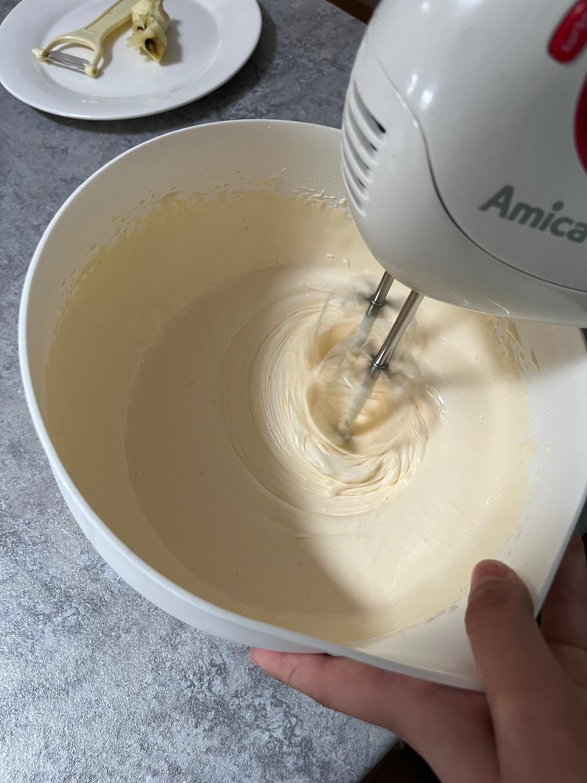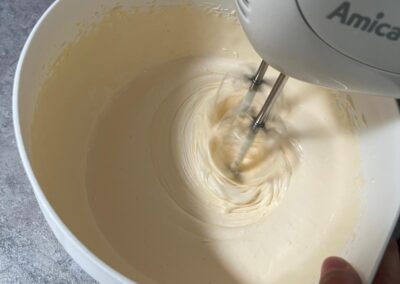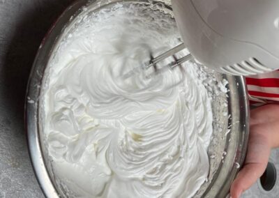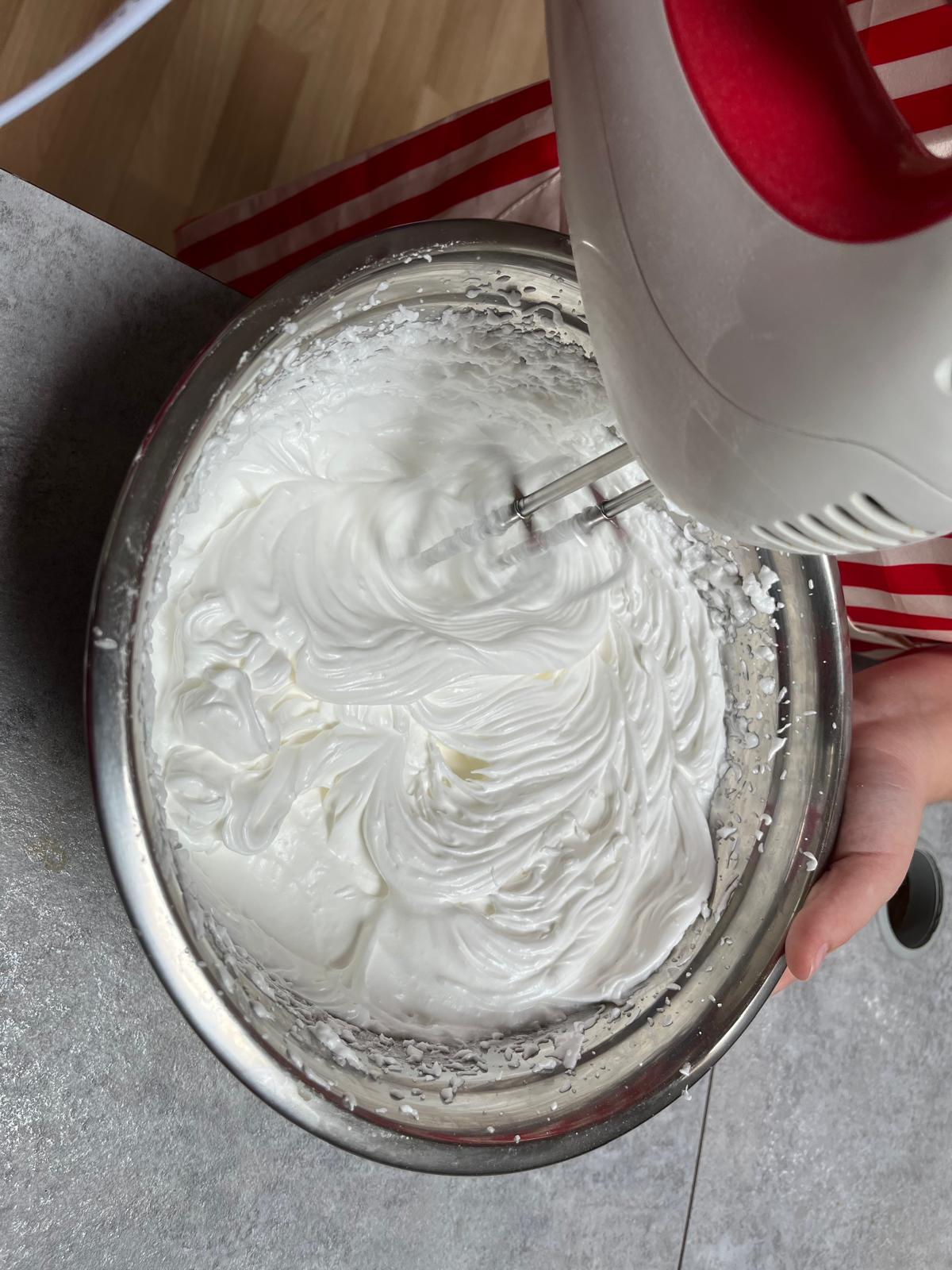 przerywając miksowania, dodać porcjami cukier. Bezę wyłożyć na upieczone
