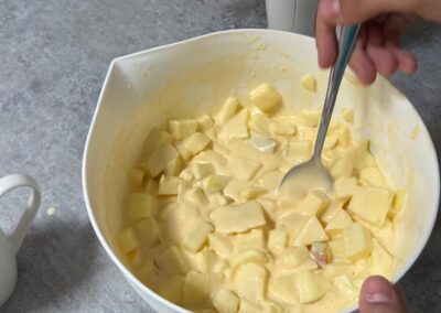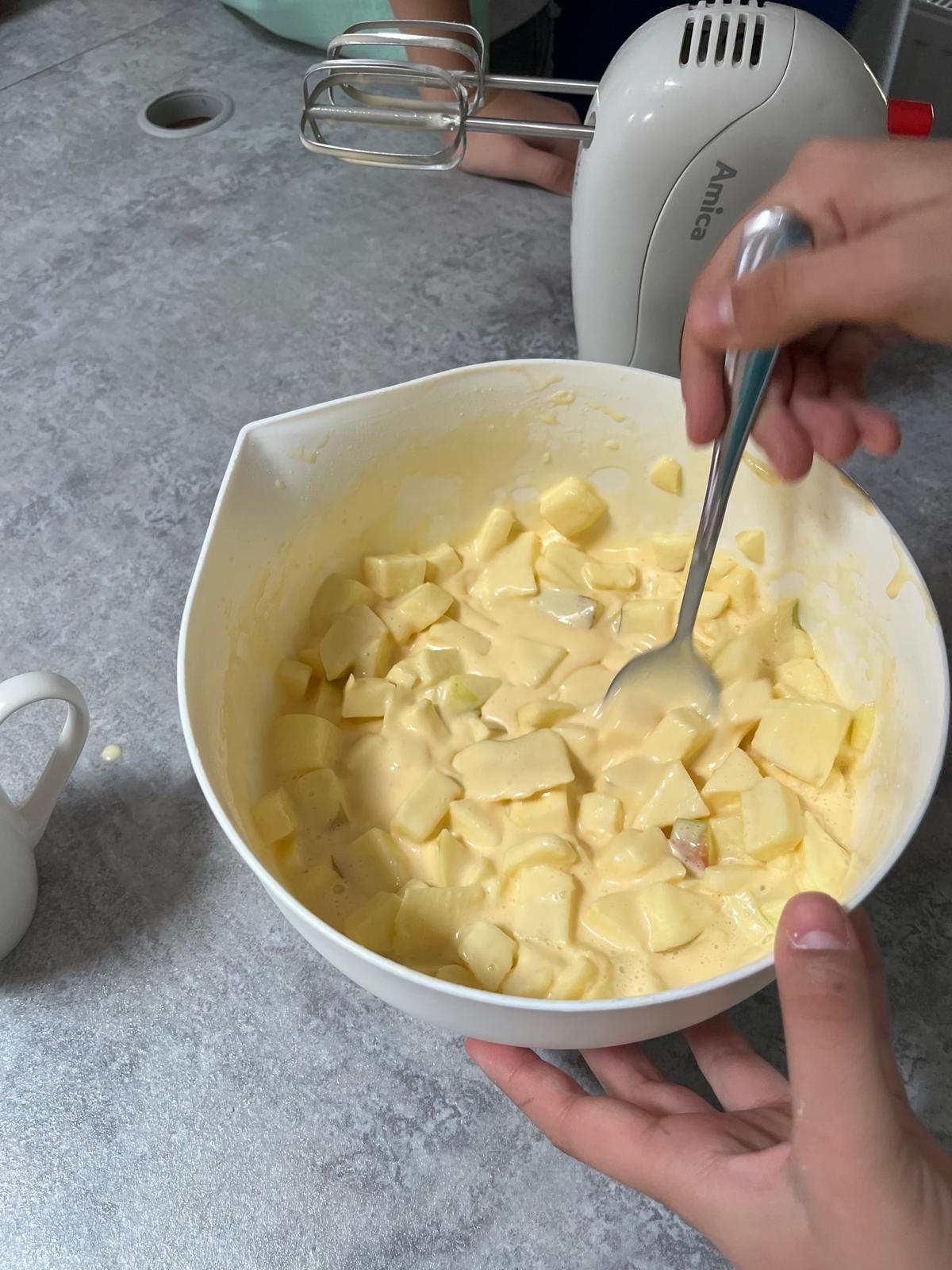 MASA JABŁKOWA: Oddzielić żółtka od białek. Białka odłożyć, aby je użyć do przygotowania bezy. Do żółtek dodać cukier, sól i cynamon, i utrzeć mikserem na kogel mogel. Dolać śmietankę oraz dosypać mąkę i zmiksować na gładką masę.